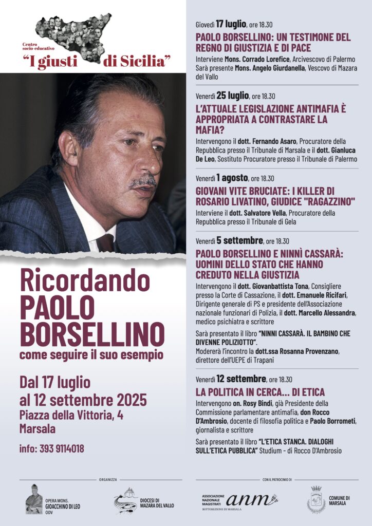 Terza rassegna estiva con “Ricordando Paolo Borsellino. Come seguire il suo esempio” organizzata dall’Opera Mons. Gioacchino Di Leo e dalla Diocesi di Mazara del Vallo, con il patrocinio dell’Associazione Nazionale Magistrati  – Sottosezione di Marsala e del Comune di Marsala. I 5 appuntamenti socio-culturali si terranno nella Piazza della Vittoria di Marsala, dal 17 luglio al 12 settembre 2025, davanti l’immobile confiscato alla criminalità organizzata dedicato alla memoria del Prefetto Fulvio Sodano e attuale sede del Centro socio-educativo “I giusti di Sicilia”.