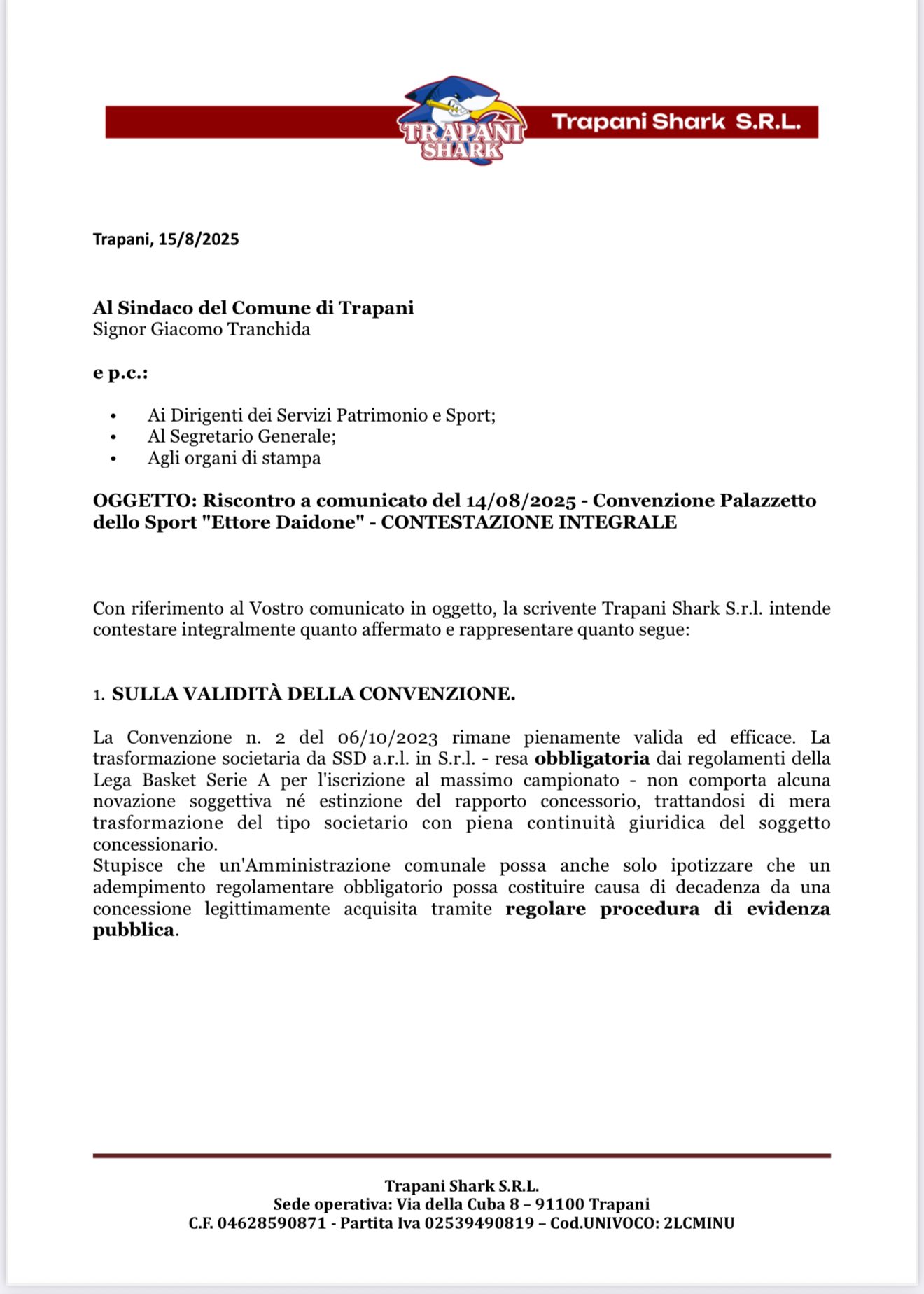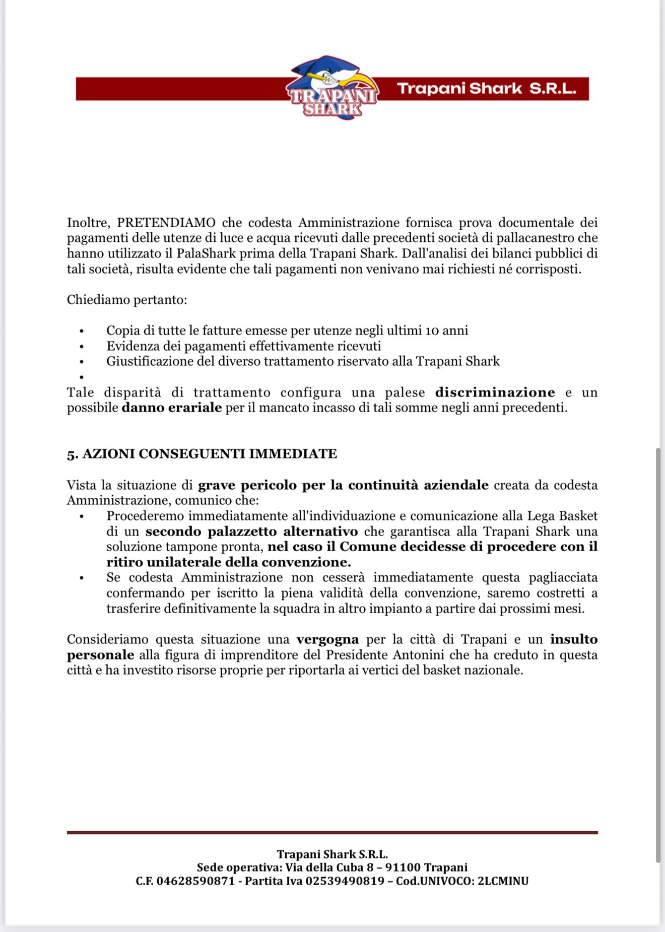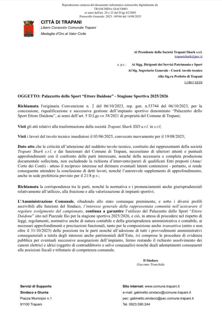Il Comune di Trapani, prima dell’incontro successivo del 19 agosto ha detto sì. Sì alla riassegnazione del Palashark (o Palazzetto Daidone) alla società di basket di Valerio Antonini. O almeno fino a quando non si risolvano alcune questioni burocratiche. In un documento si legge: “𝐿’𝐴𝑚𝑚𝑖𝑛𝑖𝑠𝑡𝑟𝑎𝑧𝑖𝑜𝑛𝑒 c𝑜𝑚𝑢𝑛𝑎𝑙𝑒, 𝑟𝑖𝑏𝑎𝑑𝑒𝑛𝑑𝑜 𝑎𝑙𝑙𝑜 𝑠𝑡𝑎𝑡𝑜 𝑐𝑜𝑚𝑢𝑛𝑞𝑢𝑒 𝑝𝑟𝑒𝑚𝑖𝑛𝑒𝑛𝑡𝑒, 𝑒 𝑠𝑜𝑡𝑡𝑜 𝑖 𝑑𝑖𝑣𝑒𝑟𝑠𝑖 𝑝𝑟𝑜𝑓𝑖𝑙𝑖 𝑎𝑠𝑐𝑟𝑖𝑣𝑖𝑏𝑖𝑙𝑖 𝑎𝑙𝑙𝑒 𝑓𝑢𝑛𝑧𝑖𝑜𝑛𝑖 𝑑𝑒𝑙 s𝑖𝑛𝑑𝑎𝑐𝑜, 𝑙’𝑖𝑛𝑡𝑒𝑟𝑒𝑠𝑠𝑒 𝑔𝑒𝑛𝑒𝑟𝑎𝑙𝑒 𝑑𝑒𝑙𝑙𝑎 𝑟𝑎𝑝𝑝𝑟𝑒𝑠𝑒𝑛𝑡𝑎𝑡𝑎 𝑐𝑜𝑚𝑢𝑛𝑖𝑡𝑎̀ 𝑛𝑒𝑙𝑙’𝑎𝑠𝑠𝑖𝑐𝑢𝑟𝑎𝑟𝑒 𝑖𝑙 𝑟𝑒𝑔𝑜𝑙𝑎𝑟𝑒 𝑠𝑣𝑜𝑙𝑔𝑖𝑚𝑒𝑛𝑡𝑜 𝑑𝑒𝑙 C𝑎𝑚𝑝𝑖𝑜𝑛𝑎𝑡𝑜, continua a garantire 𝑙’𝑢𝑡𝑖𝑙𝑖𝑧𝑧𝑜 𝑑𝑒𝑙 𝑃𝑎𝑙𝑎𝑧𝑧𝑒𝑡𝑡𝑜 𝑑𝑒𝑙𝑙𝑜 𝑆𝑝𝑜𝑟𝑡 𝐸𝑡𝑡𝑜𝑟𝑒 𝐷𝑎𝑖𝑑𝑜𝑛𝑒 𝑠𝑖𝑡𝑜 𝑛𝑒𝑙 𝑃𝑖𝑎𝑧𝑧𝑎𝑙𝑒 𝐼𝑙𝑖𝑜 𝑝𝑒𝑟 𝑙𝑎 𝑠𝑡𝑎𝑔𝑖𝑜𝑛𝑒 𝑠𝑝𝑜𝑟𝑡𝑖𝑣𝑎 2025/2026”. E ciò, si legge sempre nella nota, fermo restando l’assolvimento dei canoni elettrici e idrici – si pensa ad un conguaglio – nonchè degli adempimenti conseguenti alle posizioni fiscali e tributarie.
