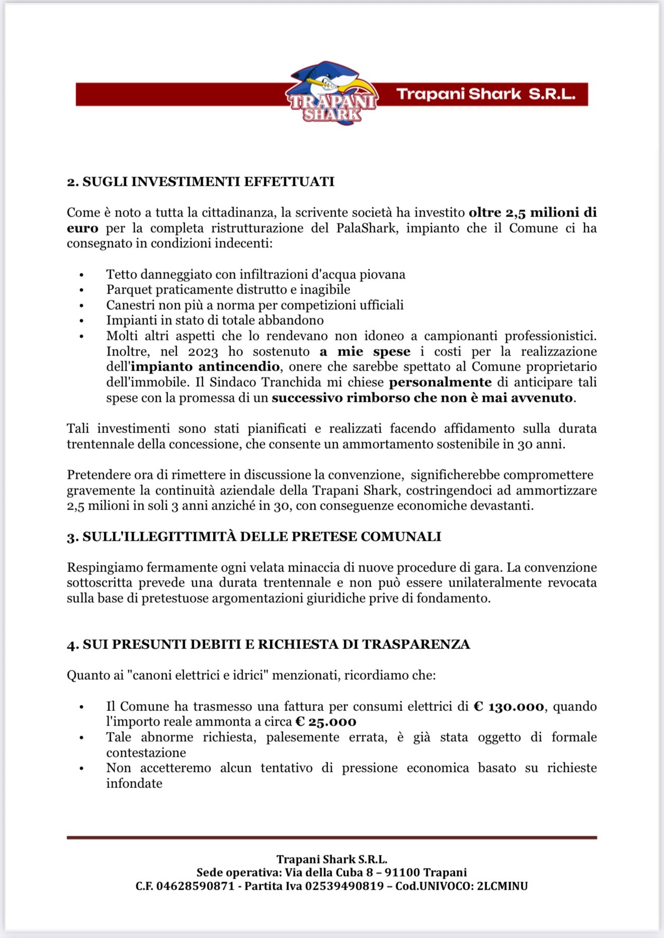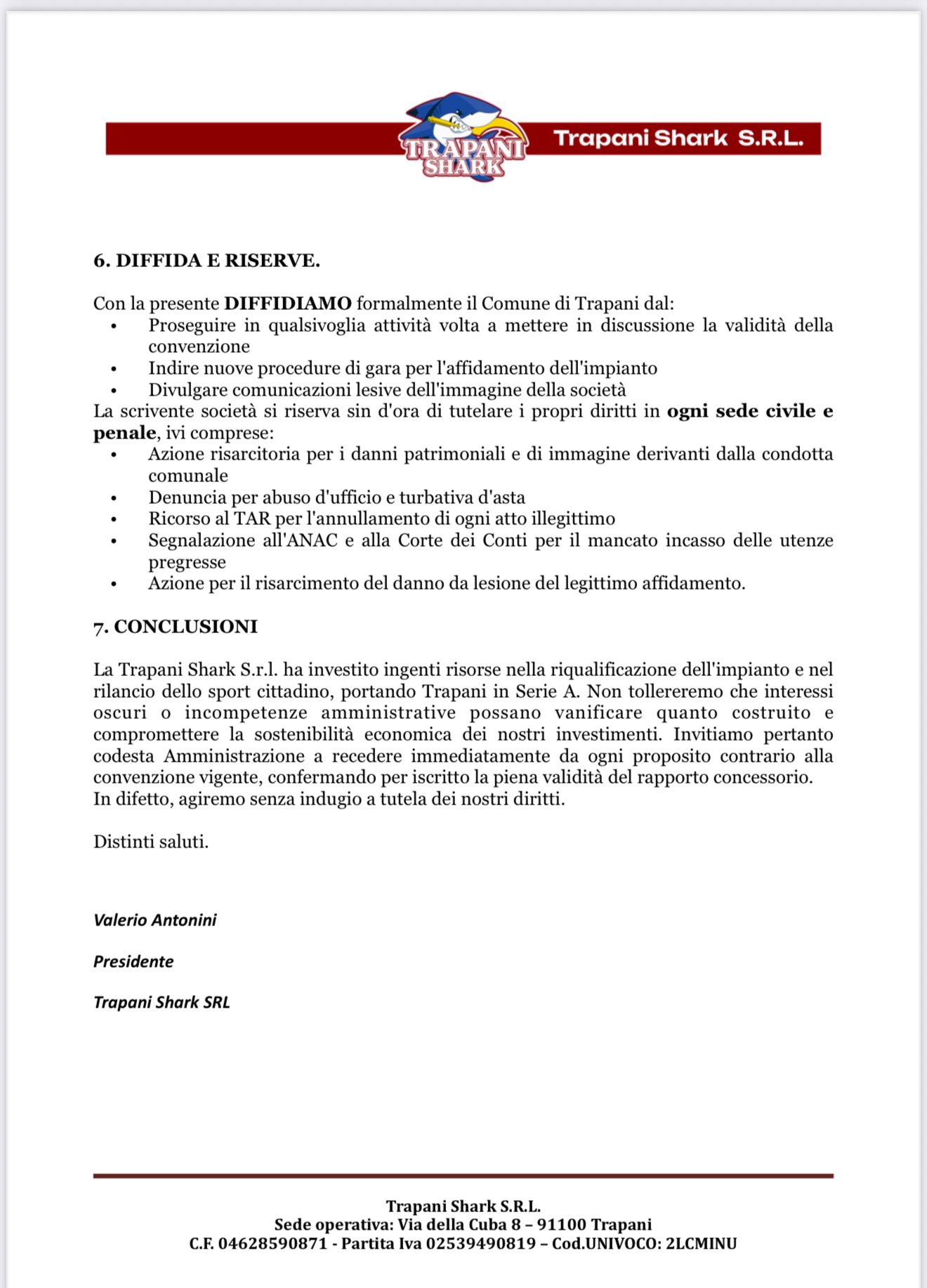 Ma le polemiche dei giorni scorsi non si placano e Antonini non è contento. Così produce un documento di risposta ad ogni parola del Comune, ovvero che la concessione era legittima, acquisita tramite regolare procedura di evidenza pubblica. Antonini continua ancora a parlare di “mettere in discussione la convenzione“, respingendo ogni pretesa di “un’eventuale gara pubblica” in quanto la convenzione per la gestione del Palashark ha durata di 3 anni e va rispettata secondo la società di basket. Antonini quindi pensa di individuare già un Palazzetto alternativo dove giocare la prossima stagione di serie A, facendo intendere di trasferire la squadra in città o chissà dove. Al termine del documento di risposta partono le “diffide”. Insomma Antonini non si accontenta.