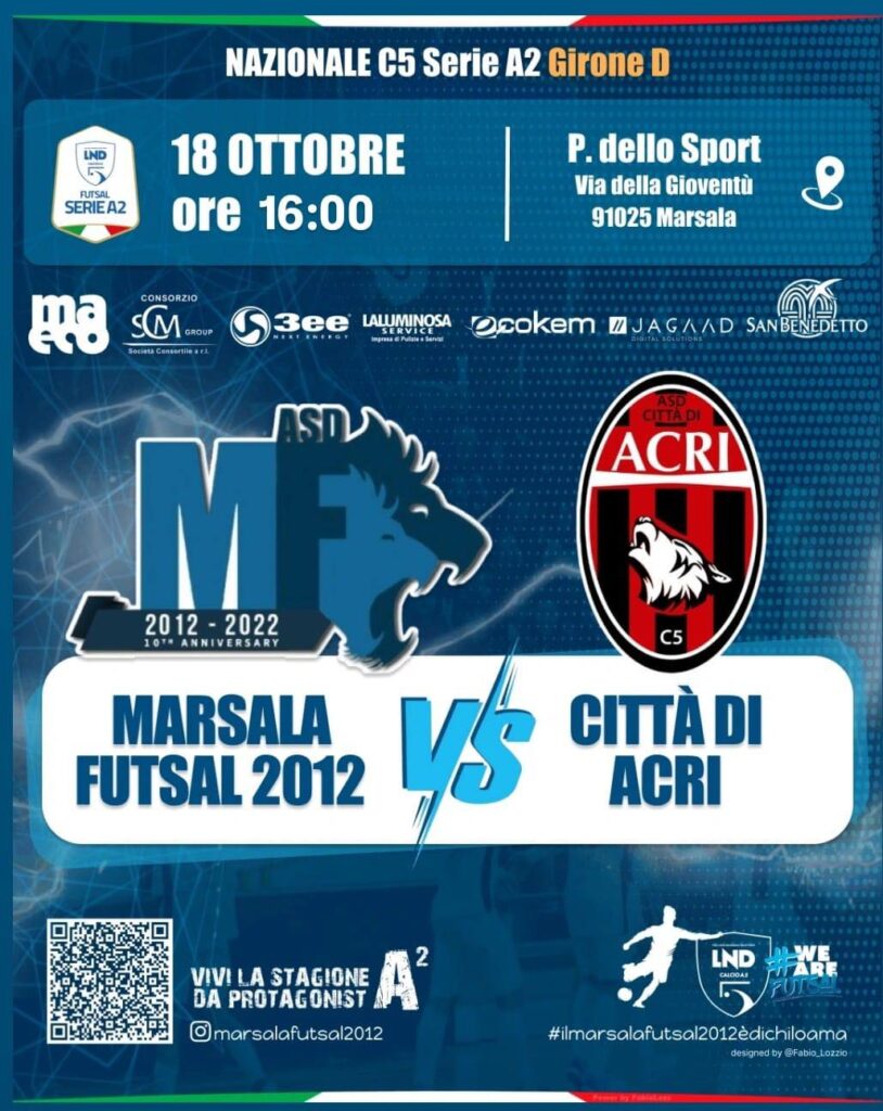 Il Marsala Futsal, reduce dalla bella vittoria a casa del Futsal Mazara, torna in campo tra le mura amiche del Palasport San Carlo sabato 18 ottobre, alle ore 16, per la prima gara interna, la seconda giornata del Campionato di A2 girone D. Questa volta sarà l’Acri a varcare la soglia del Palazzetto lilybetano. In panchina ancora l’allenatore in seconda, Giuseppe Castiglione. Il nuovo arrivato di stagione, Mattia Noto, parla a nome del gruppo in vista della prossima gara: “Ci stiamo preparando benissimo perchè davanti ai nostri tifosi dobbiamo fare bella figura. Stiamo mettendo tutti i nostri mezzi a disposizione per giocare una bella partita”. Il Marsala recupera molte assenze per squalifica, tra cui i preziosi Patti e De Bartoli, restano però fuori Romano e Valenti, che devono ancora scontare il provvedimento inflitto dal giudice sportivo. Inoltre la società comunica che per sopravvenuti impegni familiari, Luigi Avola non ricoprirà più il ruolo di Team Manager della Prima Squadra né quello di Allenatore dell’Under 15. La guida tecnica dei giovani verrà affidata al calcettista Matteo Cazzin, mentre l’incarico di Team Manager viene affidato ad interim al Responsabile del Settore Giovanile, Leandro D’Alessandro (foto: Photo Passion Events).