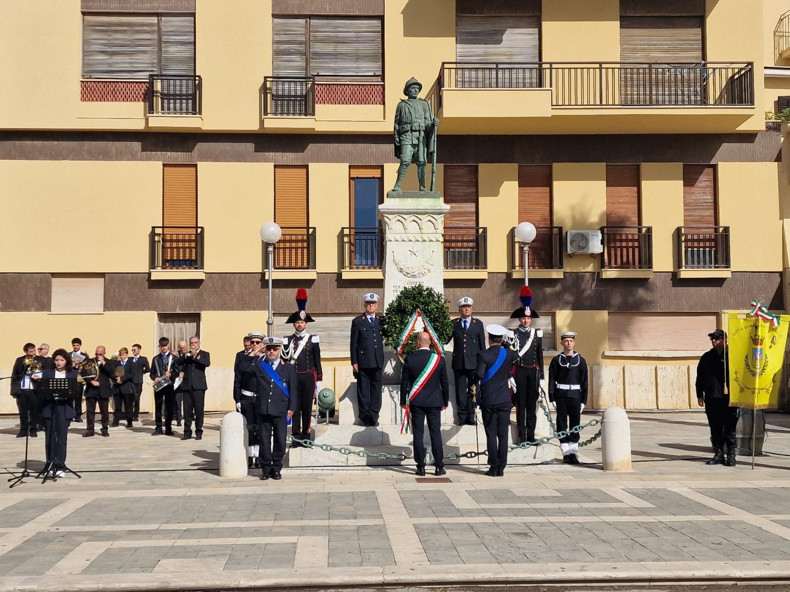 Alla cerimonia che si è svolta a Mazara del Vallo, hanno preso parte le autorità civili, militari e religiose, insieme a numerose scolaresche, alle associazioni dei militari in congedo e alla banda musicale cittadina. Dopo la Santa Messa in Cattedrale, officiata dal Vescovo Angelo Giurdanella, il corteo di autorità e cittadini si è spostato davanti al Monumento ai Caduti per la Patria, dove sono stati resi gli onori militari e osservato un minuto di silenzio in memoria dei caduti. È seguita la deposizione della corona d’alloro da parte del vice sindaco Vito Billardello, in rappresentanza del sindaco Quinci impegnato a Trapani, del comandante della Polizia Municipale Vincenzo Menfi e del comandante della Capitaneria di Porto, capitano di fregata Stefano Luciani, alla presenza dei vertici locali di Carabinieri, Polizia di Stato e Guardia di Finanza. Prima del discorso commemorativo dell’assessore alla Pubblica Istruzione Isidonia Giacalone, gli studenti intervenuti hanno sottolineato con sensibilità il valore della giornata anche dal punto di vista dei giovani, in un momento storico segnato da nuove preoccupazioni e tensioni globali.