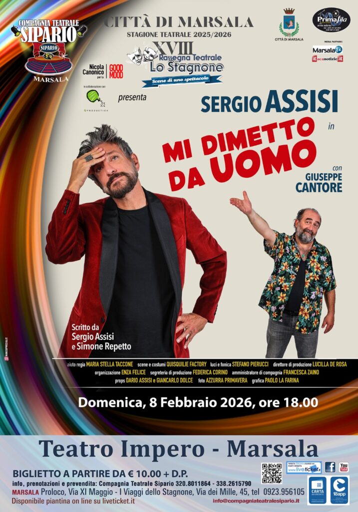 La 18ª rassegna teatrale “Lo Stagnone – scene di uno spettacolo”, organizzata dalla Compagnia teatrale “Sipario”, diretta da Vito Scarpitta, proseguirà domenica 8 febbraio, alle ore 18, sempre al Teatro Impero, con Sergio Assisi in “Mi dimetto da uomo”, accanto a Giuseppe Cantore: l’attore napoletano, star di teatro da tragedia greca a commedia napoletana, cinema con Lina Wertmüller e fiction cult come Capri e Gloria, promette un altro imperdibile mix di ironia e profondità.
