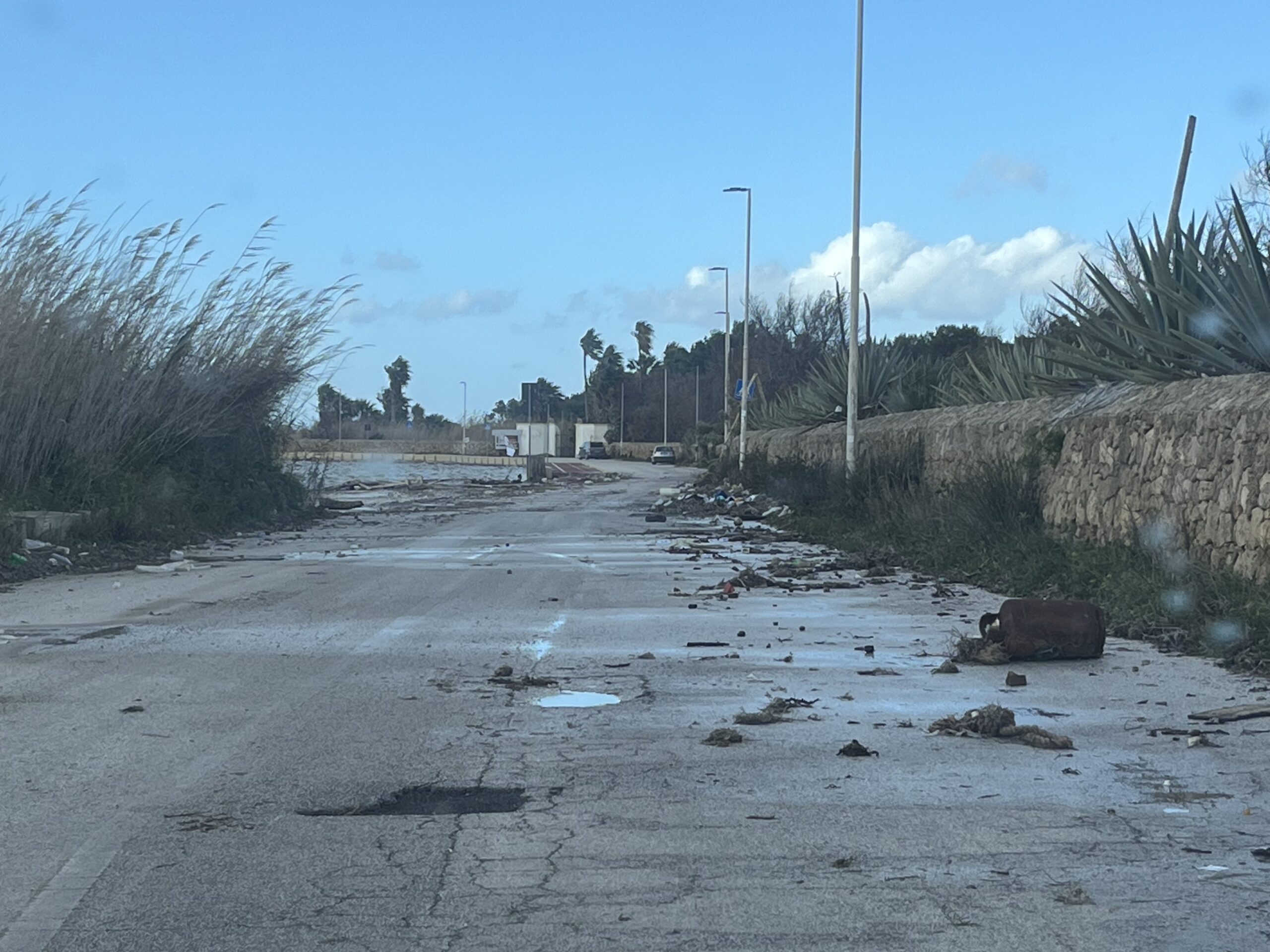 Quello che è ancora più sconcertante è che in questo momento – ma per il vero sempre – il litorale dello Stagnone sembra terra di nessuno: non c’è traccia di Vigili del Fuoco intervenuti, di Vigili urbani arrivati a transennare la strada, di una squadra della Provincia che arrivi con la pala meccanica – perchè quella ci vuole – a togliere legna, detriti, spazzatura, cestini della spazzatura volanti. Nessuno. Non ne è esente il Comune che dovrebbe sollecitare le Autorità istituzionali e militari competenti ad intervenire.