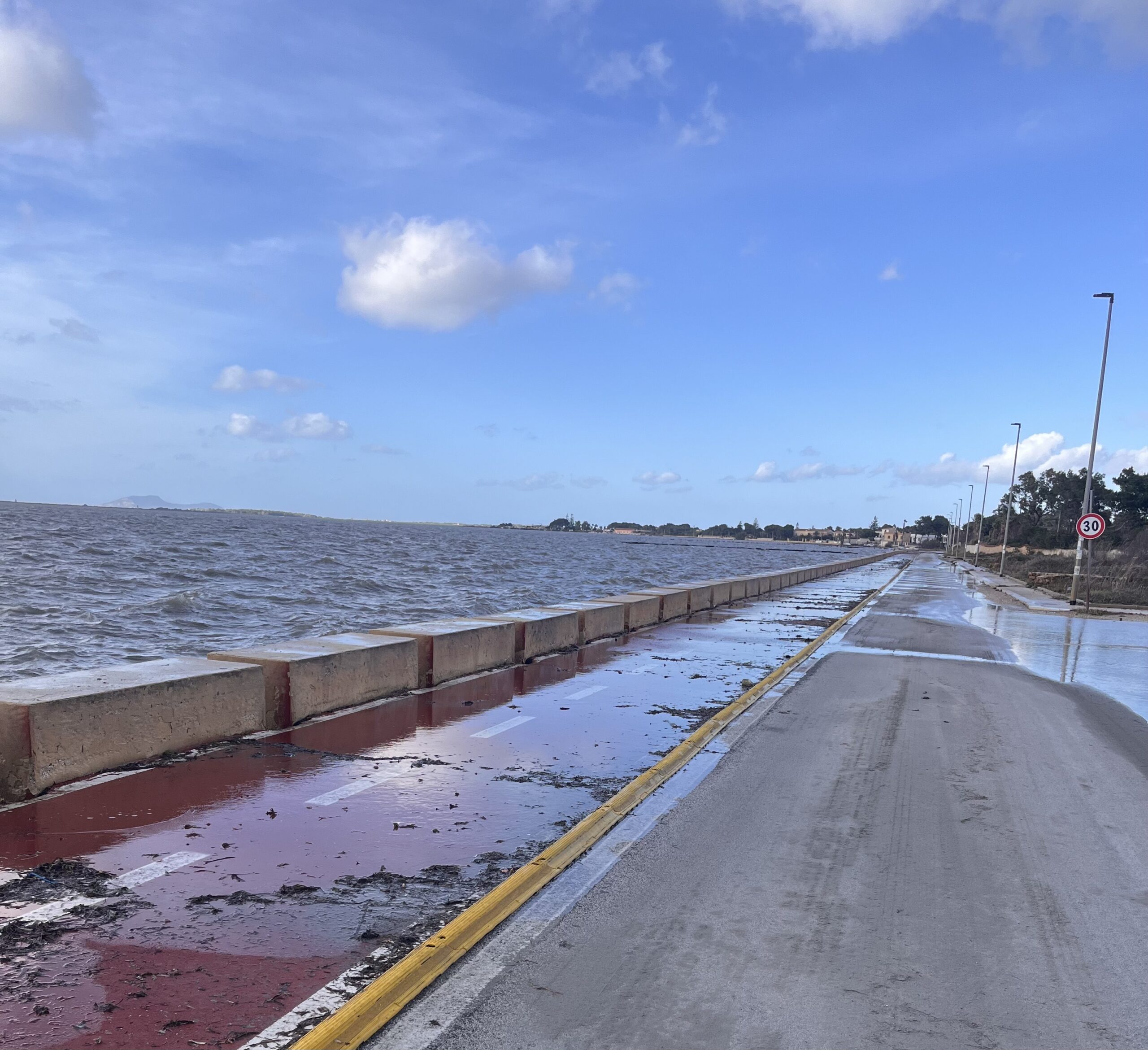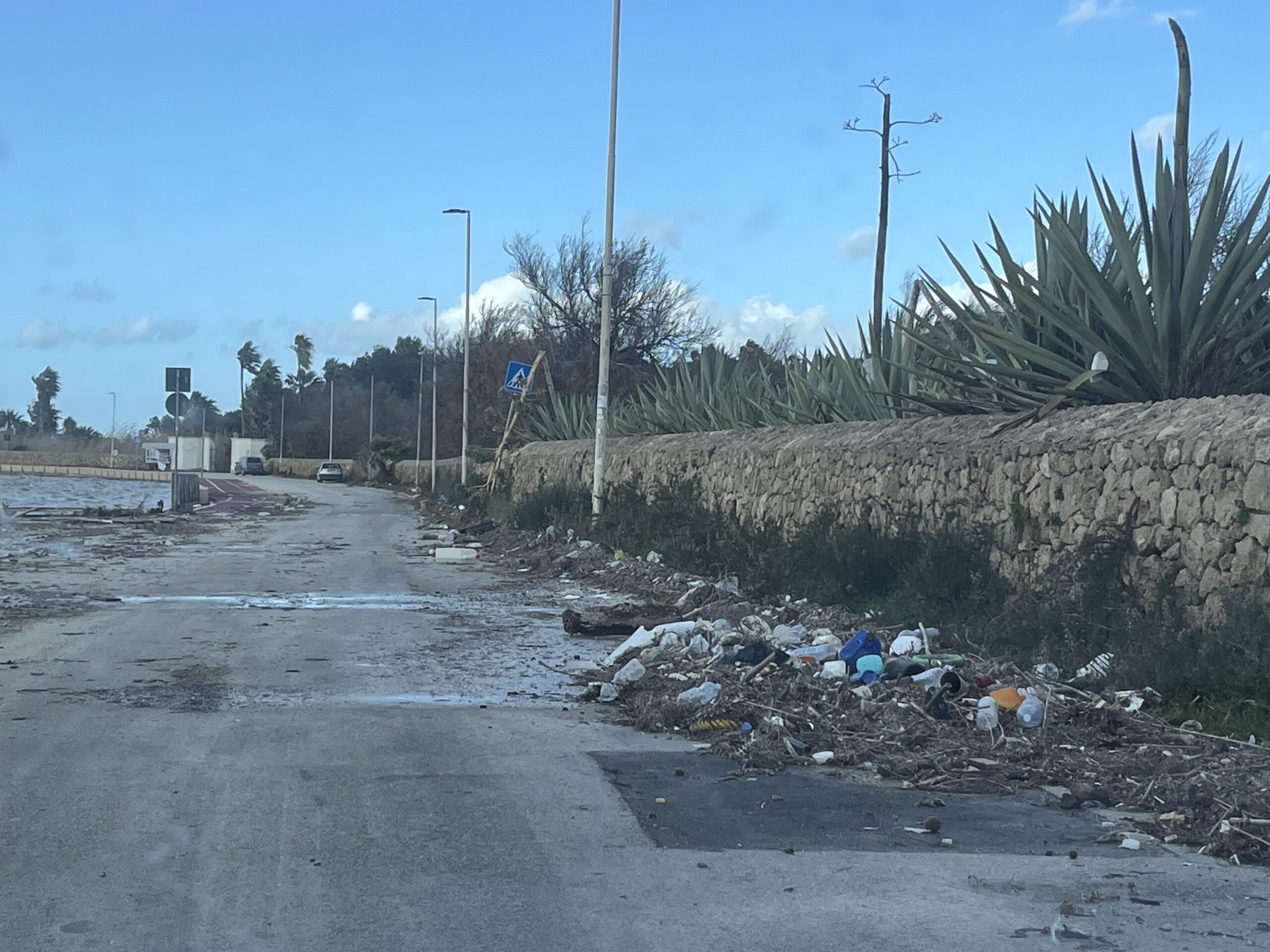 Il litorale di Marsala dopo le forti mareggiate della scorsa notte e fino alle 7 del mattino, è stato duramente messo in ginocchio. Dalla zone della Marinella, ovvero quella adiacente all’ex Caserma dell’Aeronautica fino a tutta la Riserva dello Stagnone, ci sono pozzanghere d’acqua che non defluisce in molti punti, come nel bivio tra la SP 21 e la litoranea, e detriti, con il mare che è letteralmente entrato in strada. Ed ha portato con sè quello che l’uomo – in maniera ignobile – lascia alla natura: rifiuti su rifiuti. Camminare lungo la Riserva dello Stagnone, oggi, dopo la mareggiata e il forte vento, significa ‘ammirare’ con sdegno detriti, rifiuti, plastica, vetro, semplicemente uno scempio. Le auto devono passarci sopra, come accade nella spiaggetta di fronte Villa Genna – completamente distrutta la palizzata in legno finita nell’arenile – e nel bivio con la strada di contrada Spagnola, quella che porta al Baglio Cudia. L’acqua marina e la sabbia poi ha completato l’opera, depositandosi nella pista ciclabile.