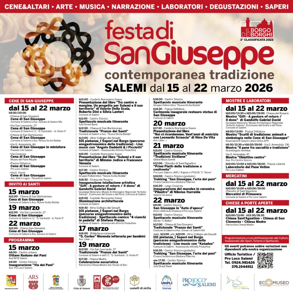 Tornano a Salemi le tradizionali Cene e gli altari di San Giuseppe, insieme a mostre, musica e numerosi eventi culturali. Dal 15 al 22 marzo la città ospiterà la “Festa di San Giuseppe – Contemporanea Tradizione”, otto giorni dedicati alla devozione popolare, alla cultura e alla valorizzazione del centro storico di uno dei Borghi più belli d’Italia.
